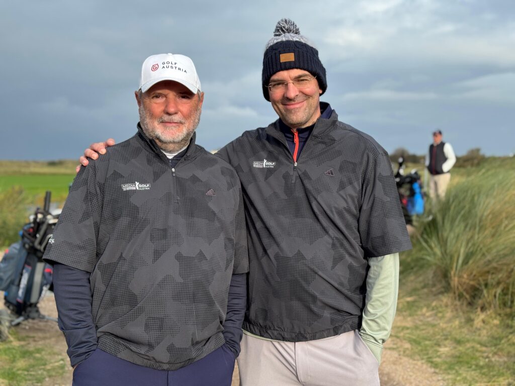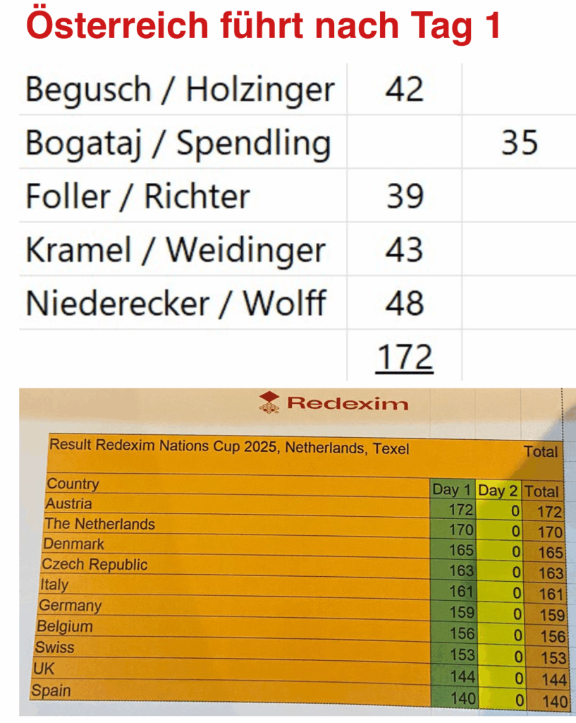 Genau genommen bleibt den neun Mitbewerbern auch nicht viel übrig, als nach Argumenten zu suchen, warum die Ösis am ersten Wettkampf-Tag das Biest von Texel derart gezähmt haben – mit 172 Punkten führen wir die Rangliste an – allerdings nur knapp, 2 Punkte vor den Platzhirschen aus den Niederlanden. Dänemark ist mit Respektabstand Dritter. Für Aufsehen sorgt die beste Runde des gesamten Turniers: Patrick und Didi spielen gemeinsam 6 unter Par, was ihnen 48 Nettopunkte einbringt.